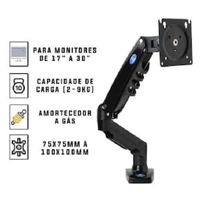 ESPECIFICAÇÕES- Este produto é compatível com a maioria dos monitores de 17 - 30; Peso máximo 9kg- A mesa na qual você está montando deve suportar no mínimo 3x o peso da carga total do suporte;- Padrão VESA - 75x75mm à 100x100mm- Produto projetado apenas para uso interno- Suporte para Monitor com pistão a gás e juntas articuladas que facilitam o ajuste;- Total flexibilidade para movimentos, sem esforço e sem a utilização de ferramentas;- Design retrátil e ergonômico, economiza espaço e promove benefícios posturais;- Permite o uso na borda da mesa ou sobre o tampo através do furo;- Fabricado em liga de alumínio fundido. Super resistente;- Com organizador de cabos integrado ao corpo do suporte.Conteúdo da Embalagem- 1x Suporte para Monitor- 1x kit de parafusos para fixação.- 1x Manual