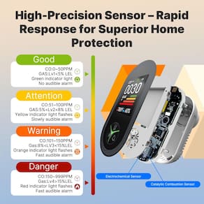 - Alarme alto e preciso – usa um sensor eletroquímico de alta sensibilidade. Quando os níveis de CO excedem 150 PPM, ele aciona um alarme sonoro e luminoso com um alerta alto de 85 dB.