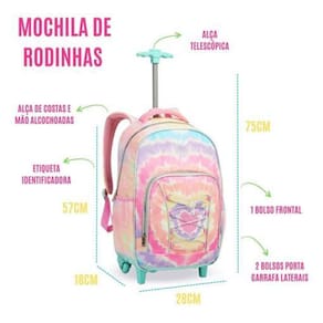 Características do produto: Mochila de rodinha - Rodinhas de silicone de alta resistência - 2 bolsos laterais para garrafa e objetos pequeno - Alças reforçada - Alças de ombro acolchoadas - Alça de mão acolchoada - Puxadores de zíper personalizada - Identificador no verso - Tamanho com rodinhas aproximado: 57cm x 28cm x 18cm - Altura total com haste puxado: 75cm