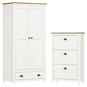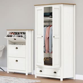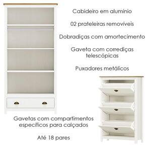 Conjunto Armário e Sapateira projetado para quem busca móveis sofisticados e atemporais. Produzido em madeira maciça de pinus de reflorestamento, sua estrutura robusta garante durabilidade e resistência. Seu acabamento com pintura acetinada em verniz PU e UV realça a beleza natural da madeira enquanto protege contra desgastes do dia a dia. O Armário possui 02 portas com dobradiças com amortecimento, e 01 gaveta com corrediças telescópicas, permitindo uma abertura suave e silenciosa. Além de 01 cabideiro em alumínio, e 03 prateleiras sendo 02 removíveis, podendo ajustar o espaço interno conforme a necessidade. A Sapateira conta com 03 gavetas com compartimentos específicos para calçados e amplo espaço para armazenamento, comportando até 18 pares. O design funcional apresenta também puxadores metálicos no estilo concha que agregam um charme artesanal, enquanto os pés alongados em madeira trazem leveza e sofisticação ao móvel. Estes móveis chegarão em sua casa separados em 03 volumes.