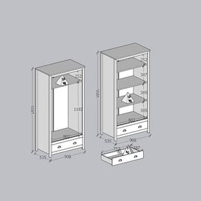 Peso Suportado: Prateleiras 10Kg, gavetas 05Kg e cabideiro 08Kg distribuídos