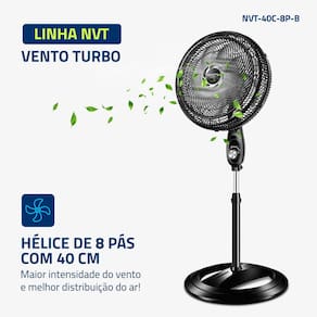Especificações Técnicas Modelo: NVT-40C-8P-B Cor: Preto/Prata Voltagem: 220V Itens inclusos: 01 Ventilador; Manual de Instruções Potência: 140W Número de velocidades: 03 velocidades Quantidade de pás: 8 pás Coluna ajustável: Sim Tipo de ventilador: Ventilador de Coluna Inclinação regulável: Não Oscilante: Sim