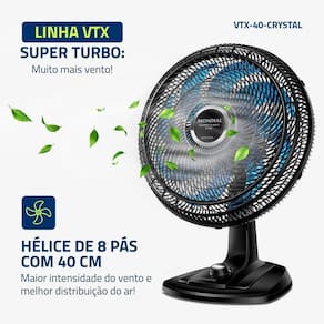 O Ventilador de Mesa Mondial Super Turbo VTX-40-CRYSTAL foi projetado para oferecer uma ventilação potente e eficiente. Ele é o primeiro ventilador do Brasil com 8 pás e conta com 40 cm de diâmetro, proporcionando uma maior intensidade de vento e uma distribuição de ar superior. O aparelho conta com três opções de velocidade, inclinação vertical ajustável e oscilação horizontal contínua, permitindo que você personalize o fluxo de ar para o seu conforto. Além de potente, o ventilador é silencioso, ideal para uso em qualquer ambiente, seja para estudos, trabalho ou para uma boa noite de sono.