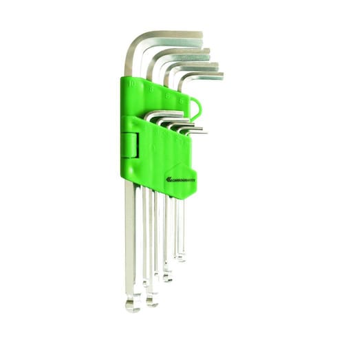 Jogo com 9 peças. Medidas: 1,5mm; 2,0mm; 2,5mm; 3,0mm; 4,0mm; 5,0mm; 6,0mm; 8,0mm; 10,0mm. Aço cromo vanádio. Padrão sistema métrico (mm). Estojo plástico de alta resistência. Permite trabalhar com ângulo de até 25° em relação ao eixo do parafuso.