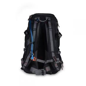 1 - capa de chuva embutida. Feita em náilon ripstop. 2 - suporte para cantil de hidratação, com presilha na alça e bolsa interna. 3 - fitas para descansar a mão 4 - fita peitoral com apito para emergências 5 - costas com apoio acolchoado e com tecido respirável 6 - acesso também pelo fundo, com divisória interna por zíper. 7 - três bolsos externos na parte frontal - superior com forro próprio para máquina digital. 8 - dois bolsos laterais expansíveis 9 - fitas compressoras laterais e frontal 10 - alças acolchoadas 11 - cinturão abdominal 12 - alça superior para transporte 13 - bolso frontal 14 - fechamento por zíper