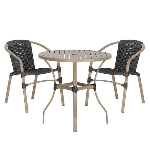 Composto por cadeiras de aluminio tramadas em corda nautica e uma elegante mesa com tampo ro, esse conjunto une sofisticacao e resistencia em cada detalhe.