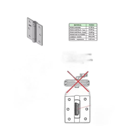 Dobradiça com Mola para fechamento automático suave das portas. Utilizada no lugar das molas aéreas funciona perfeitamente em portas pesadas e leves. Com uma mola interna de fácil regulagem da força de fechamento é super fácil de instalar, discreta mantendo a estética da porta e economiza espaço que uma mola aérea convencional ocupa. Características Medidas: 3.1/2 x 3 79 x 89mm Espessura: 2mm Material: Aço Acompanha Chave Allen para regulagem: Sim Capacidade de peso: 20 kg por dobradiça Dica Em portas de 2,10 de altura, mesmo pesando menor do que 60 kg o ideal é ser colocado 3 dobradiças para um bom funcionamento da mola Instruções para Instalação e regulagem 1 Encaixe a chave Allen na cavidade sextavada 2 Retire o Pino de Ajuste girando e pressionando a chave contra a dobradiça 3 Fixe a dobradiça de maneira convencional, depois de retirar o pino de ajuste 4 Com a porta fechada, encaixe novamente a chave allen na cavidade sextavada 5 Gire-a em sentido anti-horário, pressionando-a contra a dobradiça 6 Recoloque o pino de ajuste no orifício mais à esquerda 7 Cada orifício corresponde a uma pressão para fechar a porta. Quanto mais girar a chave a direita e colocar o pino a esquerda, maior será a pressão. ajuste da maneira necessária a sua necessidade Marca: Não Informado