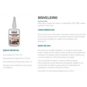 Papéis e outros. Modo de usar: Para obter um resultado satisfatório, as superfícies devem estar limpas, isentas de óleo e sujeira. Deve-se aplicar uma camada fina de adesivo em apenas 1 um dos substratos a serem colados, pois o excesso prejudica o bom desempenho da colagem. Após aplicação do adesivo, devem-se manter as peças pressionadas por aproximadamente 10 segundos, onde a cura inicial estará concluída e a peça poderá ser manuseada com segurança. A cura total ocorrerá em 24 horas. Se necessária limpeza do excesso de adesivo deve ser feita com acetona ou MEK metil etil cetona . Não adere a plásticos a base de poliolefinas PP , silicone e Teflon Marca registrada Dupont . Para essa adesão utilize o Primer poliolefínico TEK BOND. Para manuseio do produto, recomenda-se a utilização de EPIs. Para maiores informações de segurança, consultar a FISPQ do produto. Madeira com Madeira: - 15 segundos. Borracha com Borracha: - 10 segundos. Plástico com Plástico: - 15 segundos Couro com Couro: - 20 segundos Marca: Não Informado