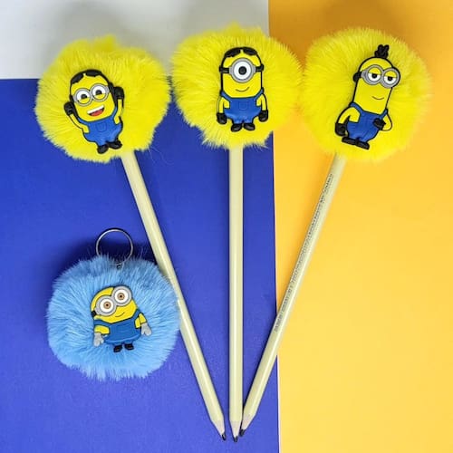 03 lápis de escrever com pompom e aplique Mions