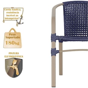 Composto por cadeiras de aluminio tramadas em corda nautica e uma elegante mesa com tampo ro, esse conjunto une sofisticacao e resistencia em cada detalhe.