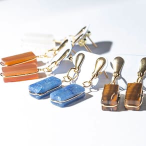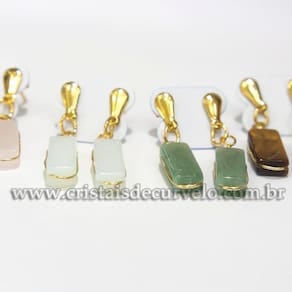 Brincos com pedras naturais mistas em formato retangular ranhurado, montados com pino e tarracha em metal com banho flash dourado. Lapidação artesanal feita manualmente, com polimento em tambor vibratório para realce do brilho e acabamento refinado.