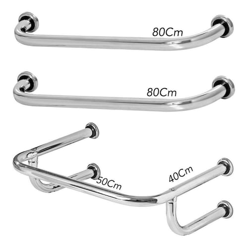Conteúdo da embalagem - 2 Barras de apoio para banheiro de 80Cm e 1 Barra de apoio para lavatório 50x40Cm.