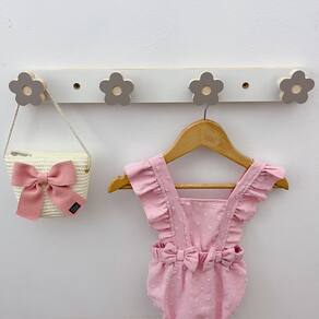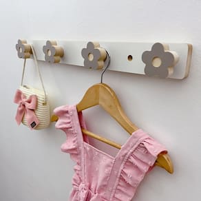 Dimensão do cabideiro: Base parede: 45cm largura X 5cm altura X 1,5cm profundidade; Gancho: 6cm largura X 5cm altura X 1,5cm profundidade; Suporte para gancho: 3cm largura X 1,5cm profundidade; Material: MDF Melamínico 15 mm com bordas cru (sem pintura).