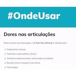 Gel de Reposição para Tens Alivio Já G-tech Regiões onde não se deve usar o produto:O produto não deve ser aplicado sobre:- A artéria carótida (região lateral do pescoço),- Na região anterior do pescoço (nuca),- Na região frontal da cabeça (testa e face),- Sobre as mamas,- Nas regiões íntimas e sobre feridas abertas.Seu uso também é contraindicado em pacientes portadores de marcapasso, em partes do corpo que tenham próteses metálicas e durante a gravidez (a segurança da estimulação elétrica em grávidas não está estabelecida). Conteúdo da embalagem:1 par de Gel condutor adesivo