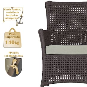 A corda náutica adiciona um toque de rusticidade moderna, enquanto o estofado impermeável garante que sua poltrona esteja sempre impecável, mesmo após uma chuva inesperada ou um acidente com líquidos.