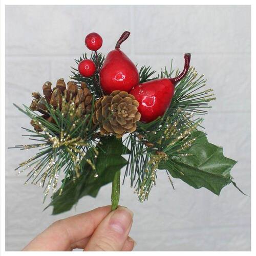 Possui 1 Ramo, com 2 Pera, 2 Pinhas. Altura: 16 cm Cor: Verde, Vermelho. Material: Plástico, Isopor.