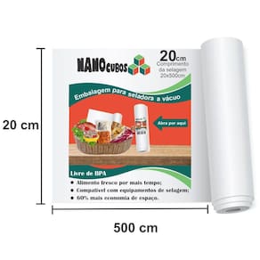 1 Rolo Nanocubos 20x500cm Sacos Ranhura para Seladora a Vácuo Embalagem 1 rolo Nanocubos 20 cm X 500 cm para seladoras a vácuo. Embalar produtos a vácuo é a melhor forma de mantê-los sempre protegidos por muito mais tempo. Ao embalar alimentos, a validade deles é completamente estendida, pois eles não terão nenhum contato com o ar e serão pouco afetados pela ação do tempo. Você pode embalar tanto alimentos crus como alimentos já preparados para serem consumidos em outro momento. Você economiza muito dinheiro e evita o desperdício Os sacos para vácuo Nanocubos são produzidos com alta tecnologia em Nylon Poli seguindo padrões de qualidade internacional. Possuem 12 micras, 3 barreiras de proteção, sem presença de BPA Não tóxicos e funcionam com equipamentos de embalagens a vácuo. Além de alimentos, é possível utilizá-lo com objetos pessoais, documentos ou utensílios, conservando-os como novos por muito tempo e aumentando sua vida útil.