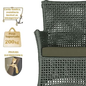 A corda nautica adiciona um toque de rusticidade moderna, enquanto o estofado impermeavel garante que sua Sofa esteja sempre impecavel, mesmo apos uma chuva inesperada ou um acidente com liquidos.
