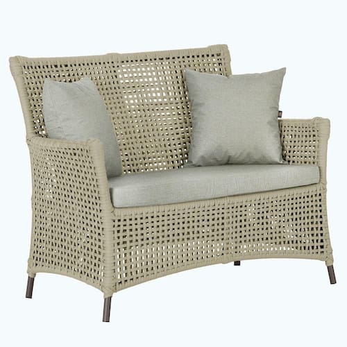 A corda nautica adiciona um toque de rusticidade moderna, enquanto o estofado impermeavel garante que sua Sofa esteja sempre impecavel, mesmo apos uma chuva inesperada ou um acidente com liquidos.