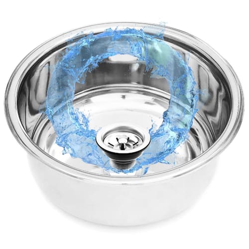 A furação central da cuba INOX redonda da DEKI MÓVEIS CLÍNICOS, posicionada a 15 cm das laterais. Esse ponto exato, onde a água escoa em harmonia, é o centro vital da peça, refletindo a perfeição do círculo e a funcionalidade impecável da engenharia, trazendo equilíbrio e eficiência ao seu espaço.