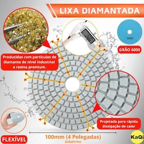 Transforme o acabamento das suas superfícies com a Lixa Diamantada 4 Polegadas 100mm da KaQi + o Disco Suporte Prato 4 Polegadas 100mm Desenvolvida para oferecer o melhor polimento e acabamento, é perfeito para quem busca resultados profissionais, tanto em pedras como granitos, mármores, cerâmicas, quanto ardósia, calcário, dekton, quartzo, porcelanato, pedra projetada, concreto, nanoglass, super nano, vidro e muito mais. Seu lixamento pode ser a seco e a úmido, o que proporciona um processo mais rápido, sem gerar calor excessivo. Assim, é possível garantir um resultado sem manchas ou falhas, e ainda favorece um efeito brilho d'água incrível