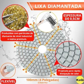 Transforme o acabamento das suas superfícies com a Lixa Diamantada 4 Polegadas 100mm da KaQi + o Disco Suporte Prato 4 Polegadas 100mm + Pino Adaptador M14 Desenvolvida para oferecer o melhor polimento e acabamento, é perfeito para quem busca resultados profissionais, tanto em pedras como granitos, mármores, cerâmicas, quanto ardósia, calcário, dekton, quartzo, porcelanato, pedra projetada, concreto, nanoglass, super nano, vidro e muito mais. Seu lixamento pode ser a seco e a úmido, o que proporciona um processo mais rápido, sem gerar calor excessivo. Assim, é possível garantir um resultado sem manchas ou falhas, e ainda favorece um efeito brilho d'água incrível