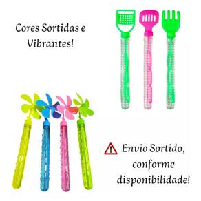 Conteúdo: 10 Tubos bolha sabão (modelo catavento ou talher - envio conforme disponibilidade)