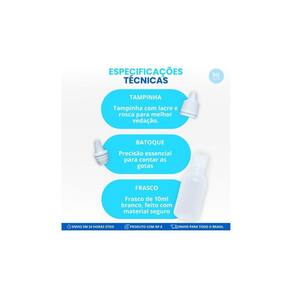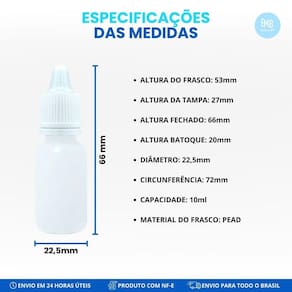 Altura do Frasco: 53mm Altura da Tampa: 27mm Altura com Tampa: 66mm Altura do Batoque: 20mm Diâmetro: 22.5mm Circunferência: 72mm Capacidade: 10ml Material: PEAD Polietileno de Alta Densidade