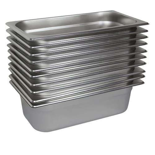 Kit com 10 cubas GN 1/3 de 150mm. Ideal para pratos quentes em buffets compactos de grande fluxo.
