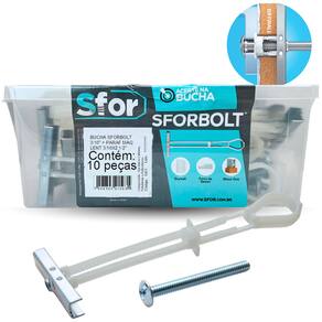 Ficha Técnica: Marca: SFORBOLT Modelo: Bucha SFORBOLT Diâmetro Nominal: 3/16 polegadas Material: Nylon de alta resistência e Parafuso de metal Diâmetro do furo: 1/2 13 mm Comprimento do parafuso: 63 mm Diâmetro do parafuso: 3/16 x 2.1/2 Espessura da base de fixação: 10 á 57 mm Carga Recomendada Drywall : 20 Kgf Carga Recomendada Bloco Concreto: 55 Kgf Quantidade: 10 Kits Quantidade de peças totais: 20pçs