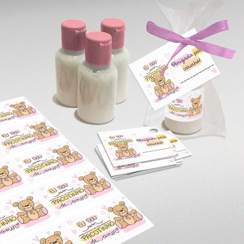 Frascos Cristal de 30ml, com tapas transparentes com hidratante cheirinho de bebê 1 etiqueta para cada lembrancinha 1 tag com furo para cada lembrancinha 1 fita de cetim para cada lembrancinha 1 saquinho de celofane transparente para cada frasco