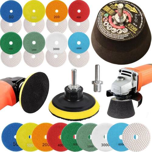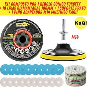 10 Lixas Grão 4 Pol. 100mm Diamantada + 1 Rebolo Cônico + 1 Disco Prato + 1 Pino M14 KaQi GRÃO: 400x4-800-1500x3-3000x2 Kit 10 Lixas Diamantadas Grão Disco 4 Polegadas 100mm KaQi + 1 Rebolo Grão 120 Copo Cônico 45 Graus 4 Polegadas M14 Forcety. + 1 Suporte Prato Disco 100mm M14 KaQi + 1 Pino Adaptador Multiuso Rosca Universal M14 KaQi. Para Desbastes, Polimentos, Acabamentos, Boleamentos, Lixamentos a Seco e Úmido. Ideal para profissionais e entusiastas de reformas e construção. Alta qualidade, resistência e desempenho superior. Desenvolvido para oferecer o melhor polimento e acabamento, é perfeito para quem busca resultados profissionais, tanto em pedras como granitos, mármores, cerâmicas, quanto ardósia, calcário, dekton, quartzo, porcelanato, pedra projetada, concreto, nanoglass, super nano, vidro e muito mais. Seu lixamento pode ser a seco e a úmido, o que proporciona um processo mais rápido, sem gerar calor excessivo. Assim, é possível garantir um resultado sem manchas ou falhas, e ainda favorece um efeito brilho d'água incrível O Rebolo Copo Cônico 10x5cm Grão 120 Forcety é ideal para desbastes, retificações, boleamentos e acabamentos. Projetado para oferecer eficiência, durabilidade, confiabilidade e resultados excepcionais, é perfeito para profissionais e entusiastas de reformas e construções. Não à toa, é o rebolo número 1 das marmorarias, azulejistas e oficinas de todo Brasil O Disco 100mm e o pino adaptador M14 podem ser utilizados em conjunto com as lixas e com o rebolo. Com sistema de gruda e desgruda fácil, podem utilizadas em lixadeiras, esmerilhadeiras, politrizes, furadeiras, parafusadeiras. Permite, assim, ampliar a gama de usos do kit. Principais características: 1. Durabilidade extra, alta resistência ao desgaste, longa vida útil e desempenho, além de excelente performance em diversos tipos de materiais. 2. Acabamento impecável no desbaste e polimento de superfícies de pedra, mármore, calcário, ardósia, porcelanato e outros, sem deixar manchas ou marcas indesejadas. Pode ser trabalhada em superfícies claras ou escuras. Oferece uma remoção eficiente de material e um acabamento uniforme. 3. Versatilidade no uso com diversas ferramentas, já que pode ser Utilizado em esmerilhadeiras, lixadeiras, politrizes e furadeiras elétricas. 4. Eficiência de montagem, uma vez que possui sistema de fixação rápido. Basta encostar a lixa no suporte do disco para grudar, e, para remover, é só puxar na direção contrária. 5. A lixa diamantada é a escolha perfeita para quem busca resultados de alta qualidade em projetos de marmoraria, granito, granilite, porcelanato, cerâmica e muito mais. Não perca a chance de ter um acabamento impecável em suas reformas e projetos. 6. de fábrica: respaldado e de fábrica Forcety, o que proporciona tranquilidade, comodidade e segurança. Especificações Lixas: Diâmetro: 100mm 4 Polegadas . Furo central: 1,3cm diâmetro. Espessura 1 unidade: 0,4cm. Maleabilidade: flexível. Lixamentos: seco e úmido. RPM: ideal entre 3000 a 5000 rotações por minuto. Material da lixa: diamante sintético industrial e resina premium. Costado: tipo vellcro. Fácil de fixar e remover. Especificações Rebolo: Trabalho: a seco ou refrigerado com água. Diâmetro: 4 Polegadas 100mm 10,16cm x altura 5,08cm. Velocidade: 9023RPM. Rosca: M14. Material: Carbeto de Silício SiC com diamantes. Feito para ser conforme norma ABNT NBR 15230. Especificações Prato Suporte: Diâmetro do disco: 100mm 4 Polegadas . Modelo do disco: M14 com superfície tipo vellcro. RPM: até 12000. Rosca: padrão M14 14mm . Especificações Pino Adaptador M14: Fixa em discos pratos M14 para uso com lixas, boinas, espumas de polir, entre outros acessórios. Rosca: M14 14mm . Pino largura: 8mm. Altura total: 4,4cm.