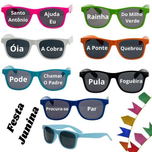 10 óculos festa junina pula fogueira festa arraiá Frases são enviada para o cliente cola Santo antonio-ajuda eu Rainha- do milho verde Óia- a cobra A ponte-quebrou Pode-chamar o padre Pula-foguêira Procura-se-par Tava - bão Vem por-arraiá Oxe-nte