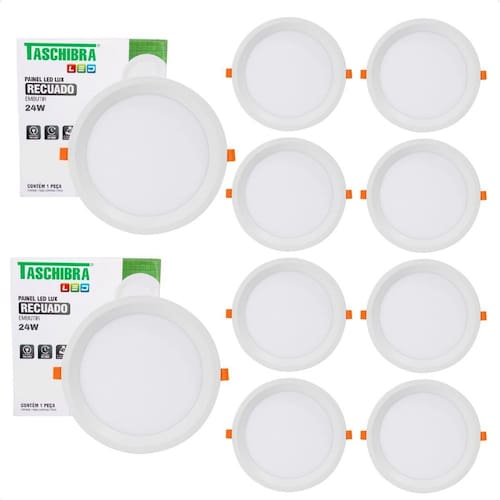 Kit 10 Painel de Led Redondo Embutir Recuado 24W Bivolt Taschibra 6500K Frio Características Gerais do Produto: Dimensões AxLxP CM : 1,6 x 22 x 22 Formato: Redondo Nicho do recorte CM : 21X21 Cor da luz: 6500K Frio Produzido em: Plástico de Engenharia, Anti-UV, Driver Onboard, Placa Interna em Alumínio e Componentes Eletrônicos Voltagem: Autovolt em 110v e 220V Alimentação: Energia elétrica Cor acabamento: Branco Potência: 24W Fluxo luminoso: 1968 Lumens IRC: 80 Ângulo de abertura: 120 : 1 ano junto ao fabricante Aplicação: Embutir Vida útil: 20.000 horas Acompanha lâmpada: Não necessita, LED já integrado Grau de proteção: IP20 Ajuste de intensidade Dimerizar : Não Acompanha o produto: 10 Painel Led Completo : 1 ano junto ao fabricante