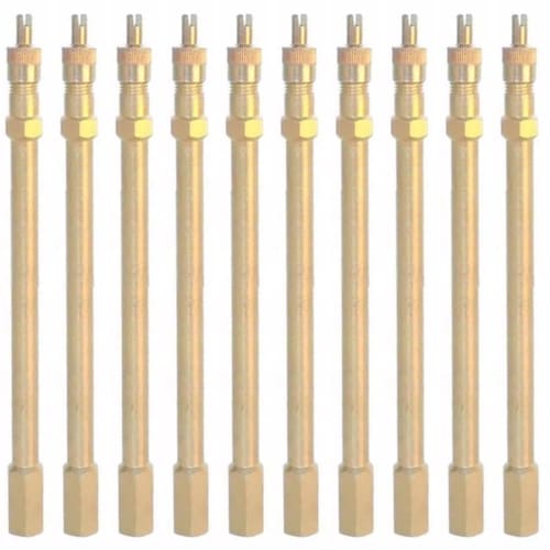 Feito em metal; Utilizado para facilitar o enchimento e calibragem de pneus; Alcance estendido. Kit composto: 10 Unidades