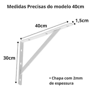 Suporte Cantoneira Mão Francesa para Prateleiras de 40cm Cor: Branca Quantidade: 10 Unidades + parafusos e buchas Medidas do Suporte: Altura: 30 cm Comprimento: 40 cm Capacidade de carga: até 10kg por peça Acompanha Parafusos e Buchas 8mm Instruções de Instalação: A distância máxima recomendada entre os suportes é de 60cm para garantir a capacidade de carga. Recomenda-se o uso de prateleiras com largura de 40cm a 45cm para manter a capacidade de carga indicada. do vendedor: 90 dias Marca: Bullcom