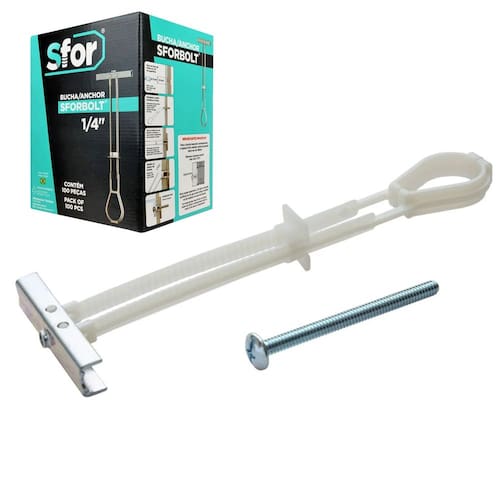 A Bucha Sforbolt é ideal para fixações rápidas e seguras em paredes ocas, como drywall, gesso, bloco e tijolo baiano. Com medidas de 1/4x2.1/2, esse modelo é fornecido em caixas com 100 unidades, já acompanhadas de parafusos rosca máquina no mesmo tamanho.