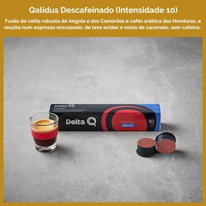 Cápsula delta q você encontra na cafezale uma bebida fresca e com aroma inconfundível, para os amantes de um bom café. Sobre a delta q - café desenvolvido conforme padrão europeu no conforto da sua casa. - as cápsulas delta q preservam sabor e aroma, para que você deguste uma bebida fresca. - cafés vindos de vários lugares no mundo, em diferentes intensidades. - produto europeu, sucesso mundial. Conteúdo 10 caixas com 10 cápsulas delta q. Sabor qalidus descafeinado intensidade 10 delta q qalidus decaf nasce da fusão de cafés robusta de angola e dos camarões e cafés arábica das honduras, e resulta num expresso encorpado, de leve acidez e notas de caramelo, sem cafeina. Com todo o aroma e corpo do seu qalidus, mas agora em descafeínado. Modelos de cafeteiras compatíveis as cápsulas funcionam em todos os modelos de cafeteira delta q. Atenção: essas cápsulas não funcionam nas cafeteiras nespresso, três corações e dolce gusto pois essas marcas usam outros modelos de cápsulas. Observações - validade: 1 a 2 meses - fabricado em portugal