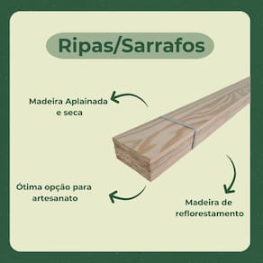Características: Ripas/Sarrafos de mandeira aplainada. Madeira Ecológica, proveniente de reflorestamento sustentável Sem nenhum tipo de tratamento Madeira natural de Pinus Madeira seca Cantos retos