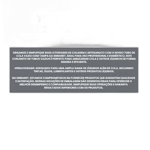 Tubo de Cola Vazio com Tampa - Loja Oficial Embanet Organize e simplifique suas atividades de colagem e artesanato com o nosso Tubo de Cola Vazio com Tampa da Embanet. Ideal para e doméstico, este conjunto de tubos vazios é perfeito para armazenar cola e outros líquidos de forma segura e eficiente. Contém: 100 tubos vazios com tampas. Altura do Frasco: 7,3 cm Altura da Tampa: 3,4 cm Altura Total Fechado : 9,6 cm Largura: 1,9 cm Capacidade: 25g Fabricados em PEAD Polietileno de Alta Densidade , esses tubos são altamente resistentes e duráveis, garantindo que seu conteúdo esteja sempre protegido. O PEAD é conhecido por sua robustez e resistência a impactos, tornando-o perfeito para aplicações repetidas. Conheça Mais Produtos na Loja Oficial EMBANET: A Embanet oferece produtos projetados para atender às suas necessidades mais exigentes, sempre com a qualidade que você merece. Escolha a Qualidade EMBANET Hoje Mesmo Marca: Não Informado