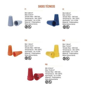 os conectores de torção emendam cabos flexíveis e fios rígidos de forma prática e segura. Ao contrário da fita isolante que resseca com o calor e o tempo os conectores mantém a emenda isolada por muito mais tempo. Protegida por uma capa isolante, encontra-se a mola interna que se expande para acomodar firmemente os condutores e os mantém unidos sob pressão constante, sem danificá-los, para soltar os fios basta girar o conector no sentido anti-horário, podendo ser em outra conexão. 1000 conectores no total 250 cinzas, 250 azuis, 200 laranjas, 200 amarelos e 100 vermelhos
