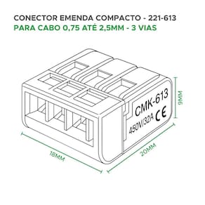 - Modelo: 221-613 - Tipo: Conector de emenda compacto - Capacidade de corrente: até 32A - Tensão máxima: até 450V - Seção dos condutores: 0,75 a 2,5mm - Número de polos: 3 polos - Compatibilidade: Fios rígidos e flexíveis - Aplicação: Emendas e derivações em instalações elétricas residenciais, comerciais e industriais - Instalação: Sem necessidade de ferramentas Marca: Não Informado