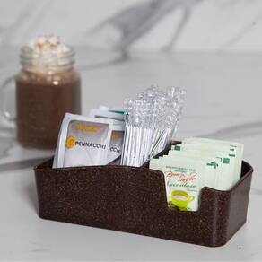 Conta com divisória para colocar sachês, palitos etc. duráveis e com qualidade.