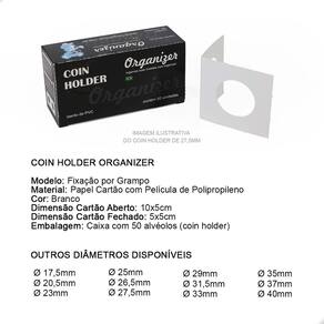 O Coins Holder Grampeável é uma importante ferramenta para armazenar e proteger suas Moedas. É um produto utilizado por colecionadores e coleções de todos os níveis: do iniciante ao avançado. Garante o bom armazenamento e proteção de suas peças.O Coins Holder tem como função proteger sua moeda:- evita o contato com o ambiente externo- evita o manuseio incorreto da peça (sem luvas ou com a mão suja)- facilita a exposição de sua peça na sua coleção- facilita a logística de sua peça, permitindo que você leve em eventos ou para negociar com mais praticidade e proteção- excelente organizador, pois centraliza a moeda no bolso da folha, deixando sua exibição muito mais bonita, organizada e apresentávelNo critério de organização, o Coins Holder se destaca ao promover a padronização da exposição de suas moedas. Tenha uma apresentação muito mais bonita e profissional utilizando Coins Holders.CARACTERÍSTICAS:Modelo: Fixação por GrampoMaterial: Papel Cartão Branco com Película de PolipropilenoDimensão Cartão Aberto: 10x5cmDimensão Cartão Fechado: 5x5cmDiâmetro deste Anúncio: Ø 31,5mmEmbalagem: Caixa com 50 alvéolos (coins holder) cada caixaOBS: Isento de PVCSUGESTÃO DE ARMAZENAMENTO DO COINS HOLDER COM A MOEDAO Coins Holder pode ser armazenado em folhas próprias para coleções de Moedas respeitando o espaço mínimo de 5x5cm cada bolso onde o holder será colocado, caixas organizadoras e separadoras, estojos (cartelas dobráveis) próprios para Coins Holders.COMO UTILIZAR:1- Para utilizá-lo você deve primeiramente dobrar ao meio, na marcação indicada, para facilitar o fechamento com a moeda.2- Em seguida, você deverá posicionar a moeda no centro do Coins Holder, em cima da película de plástico, onde a moeda será exibida. Certifique-se de que sua moeda está perfeitamente alinhada com alguma das laterais do Coins Holder pois após fecha-lo, não conseguirá mais mover a moeda. 3- Dobre o coins holder ao meio, por cima da moeda, envolvendo-a completamente. 4- Com um grampeador, grampeie a parte branca do Coins Holder. É sugerido que o grampo seja aplicado bem posicionado entre a moeda e o final do Coins Holder, pois assim prenderá corretamente a peça evitando que a mesma movimente. Também é sugerido 4 grampos para o bom fechamento do Coins Holder, mas fica a critério de cada colecionador.