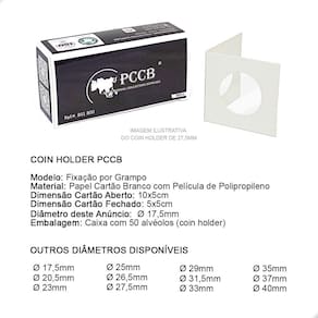 O Coins Holder é uma importante ferramenta para armazenar e proteger suas Moedas. É um produto utilizado por colecionadores e coleções de todos os níveis: do iniciante ao avançado. Garante o bom armazenamento e proteção de suas peças.O Coins Holder tem como função proteger sua moeda:- evita o contato com o ambiente externo- evita o manuseio incorreto da peça (sem luvas ou com a mão suja)- facilita a exposição de sua peça na sua coleção- facilita a logística de sua peça, permitindo que você leve em eventos ou para negociar com mais praticidade e proteção- excelente organizador, pois centraliza a moeda no bolso da folha, deixando sua exibição muito mais bonita, organizada e apresentávelNo critério de organização, o Coins Holder se destaca ao promover a padronização da exposição de suas moedas. Tenha uma apresentação muito mais bonita e profissional utilizando Coins Holders.CARACTERÍSTICAS:Modelo: Fixação por GrampoMaterial: Papel Cartão Branco com Película de PolipropilenoDimensão Cartão Aberto: 10x5cmDimensão Cartão Fechado: 5x5cmDiâmetro deste Anúncio: Ø 17,5mmEmbalagem: Caixa com 50 alvéolos (coins holder) cada caixaSUGESTÃO DE ARMAZENAMENTO DO COINS HOLDER COM A MOEDAO Coins Holder pode ser armazenado em folhas próprias para coleções de Moedas respeitando o espaço mínimo de 5x5cm cada bolso onde o holder será colocado, caixas organizadoras e separadoras, estojos (cartelas dobráveis) próprios para Coins Holders.COMO UTILIZAR:1- Para utilizá-lo você deve primeiramente dobrar ao meio, na marcação indicada, para facilitar o fechamento com a moeda.2- Em seguida, você deverá posicionar a moeda no centro do Coins Holder, em cima da película de plástico, onde a moeda será exibida. Certifique-se de que sua moeda está perfeitamente alinhada com alguma das laterais do Coins Holder pois após fecha-lo, não conseguirá mais mover a moeda.3- Dobre o coins holder ao meio, por cima da moeda, envolvendo-a completamente.4- Com um grampeador, grampeie a parte branca do Coins Holder. É sugerido que o grampo seja aplicado bem posicionado entre a moeda e o final do Coins Holder, pois assim prenderá corretamente a peça evitando que a mesma movimente. Também é sugerido 4 grampos para o bom fechamento do Coins Holder, mas fica a critério de cada colecionador. Marca: PCCB