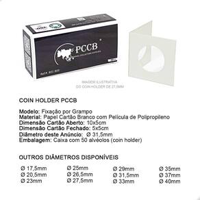 O Coins Holder é uma importante ferramenta para armazenar e proteger suas Moedas. É um produto utilizado por colecionadores e coleções de todos os níveis: do iniciante ao avançado. Garante o bom armazenamento e proteção de suas peças.O Coins Holder tem como função proteger sua moeda:- evita o contato com o ambiente externo- evita o manuseio incorreto da peça (sem luvas ou com a mão suja)- facilita a exposição de sua peça na sua coleção- facilita a logística de sua peça, permitindo que você leve em eventos ou para negociar com mais praticidade e proteção- excelente organizador, pois centraliza a moeda no bolso da folha, deixando sua exibição muito mais bonita, organizada e apresentávelNo critério de organização, o Coins Holder se destaca ao promover a padronização da exposição de suas moedas. Tenha uma apresentação muito mais bonita e profissional utilizando Coins Holders.CARACTERÍSTICAS:Modelo: Fixação por GrampoMaterial: Papel Cartão Branco com Película de PolipropilenoDimensão Cartão Aberto: 10x5cmDimensão Cartão Fechado: 5x5cmDiâmetro deste Anúncio: Ø 31,5mmEmbalagem: Caixa com 50 alvéolos (coins holder) cada caixaSUGESTÃO DE ARMAZENAMENTO DO COINS HOLDER COM A MOEDAO Coins Holder pode ser armazenado em folhas próprias para coleções de Moedas respeitando o espaço mínimo de 5x5cm cada bolso onde o holder será colocado, caixas organizadoras e separadoras, estojos (cartelas dobráveis) próprios para Coins Holders.COMO UTILIZAR:1- Para utilizá-lo você deve primeiramente dobrar ao meio, na marcação indicada, para facilitar o fechamento com a moeda.2- Em seguida, você deverá posicionar a moeda no centro do Coins Holder, em cima da película de plástico, onde a moeda será exibida. Certifique-se de que sua moeda está perfeitamente alinhada com alguma das laterais do Coins Holder pois após fecha-lo, não conseguirá mais mover a moeda.3- Dobre o coins holder ao meio, por cima da moeda, envolvendo-a completamente.4- Com um grampeador, grampeie a parte branca do Coins Holder. É sugerido que o grampo seja aplicado bem posicionado entre a moeda e o final do Coins Holder, pois assim prenderá corretamente a peça evitando que a mesma movimente. Também é sugerido 4 grampos para o bom fechamento do Coins Holder, mas fica a critério de cada colecionador. Marca: PCCB