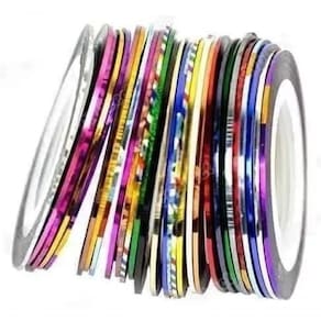 Kit com 10 rolos de fita metalizada adesiva para decoração de unhas. Espessura de 1 milímetro. Comprimento de aproximadamente 17 Metros e auto adesivas. Envio conforme a disponibilidade do estoque Referência: Fitas Metalizadas/ Fio de Ouro.
