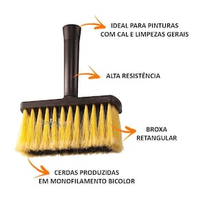 BROXA 15X5,6CMREF: 800MARCA: ATLAS-DESCRIÇÃO DO PRODUTO:-Broxa 15x5,6cm com cabo plástico e monofilamento bicolor.-Broxa retangular-Corpo produzido em plástico de alta resistência-Cerdas produzidas em monofilamento bicolor-Conectável à linha de prolongadores Atlas-Comprimento: 19,5 cm-Largura: 15 cm-Altura: 5,6 cm-Cor: Preto-INDICAÇÃO DE USO:Ideal para pinturas com cal e limpezas gerais.