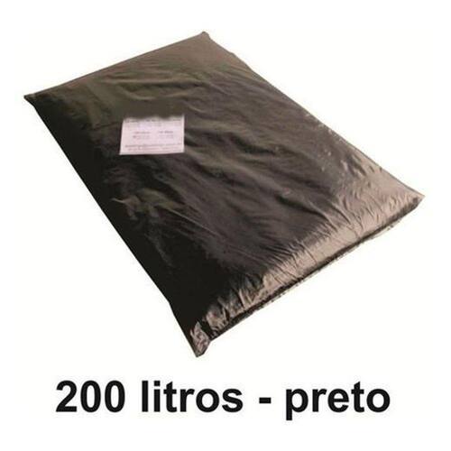 Saco de lixo 200 litros preto reforçado / espessura: 0,20 micras Quantidade: aproximadamente 103 sacos na embalagem de 15 kilos Boca: aproximadamente com 90cm Comprimento: aproximadamente com 130cm