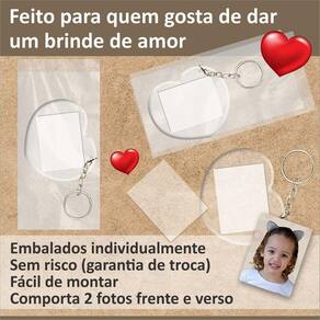 Atenção -O valor do anúncio é para 150 chaveiros de coração Despacho em 24 horas Tem uma dúvida. Um presente que mostra seu amor pelo próximo ....Medida do produto: 5cm largura x 6 cm altura Medida para personalização: 3cm largura x 4cm altura Personalize com sua marca ou foto do filho ou amor da sua vida.Pode colocar 2 fotos frente e verso em papel fotográfico 180grFavor verificar montagem na explicação na 4 foto do próprio anúncio Acompanha: corpo + lente + corrente e argola.Embalado individualmenteProduto fornecido sem personalizaçãoMaterial: ps cristal acrílico História clipO suíço, alexander buholzer decidiu quando mais velho vir a america do sul. O clima e a recepção dos brasileiros fizeram com que o brasil se destacasse entre os outros países, e , portanto em 1994, escolheu ficar e montar sua empresa nesta linda terra tropical.Alex desde pequeno tinha um grande interesse em guardar todos os retratos da sua família, principalmente, porquê sem estas fotos não existiriam histórias . Assim nasceu a empresa clip juntos com ela todos os seus álbuns, porta retratos e produtos para guardar suas melhores lembranças de vida................